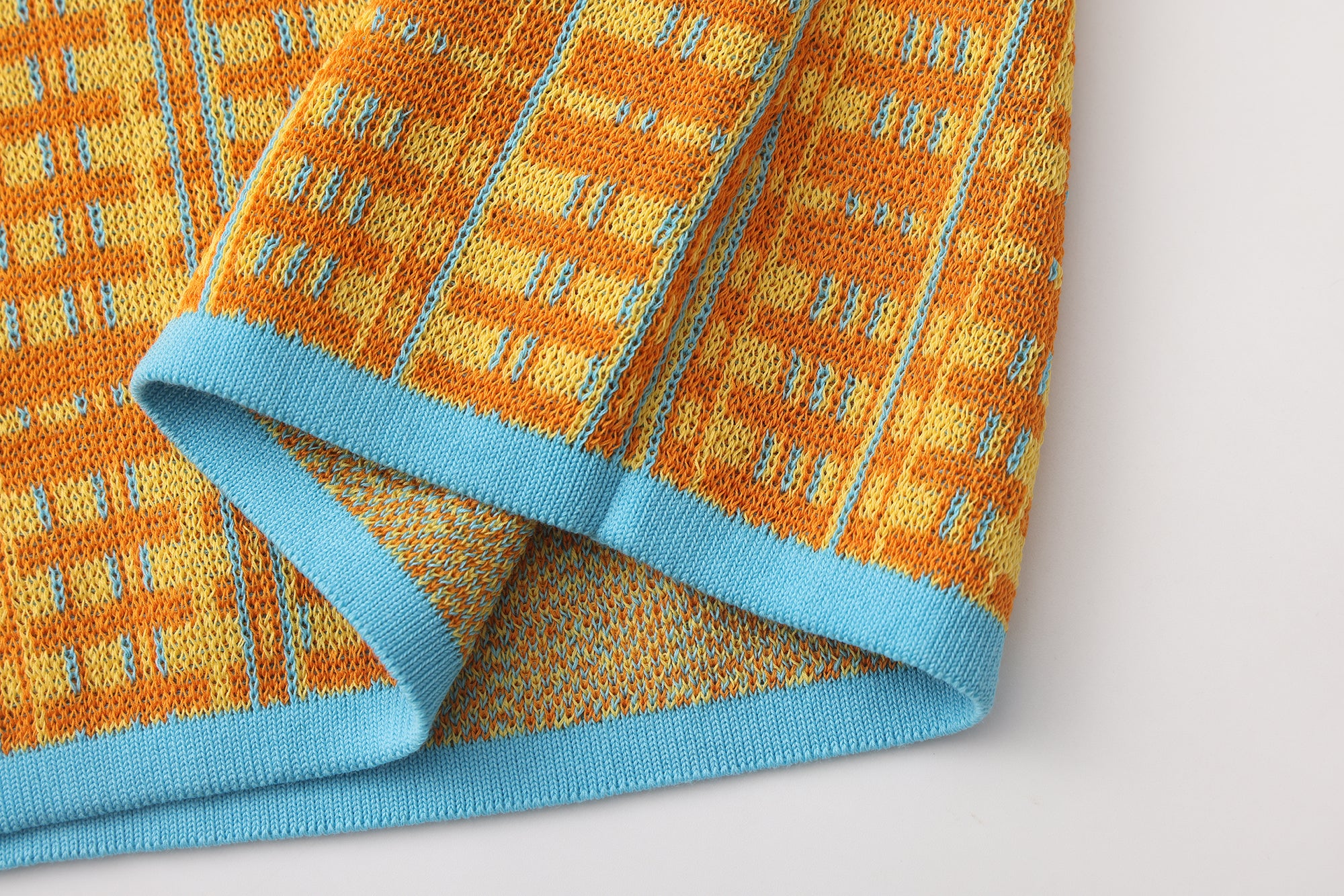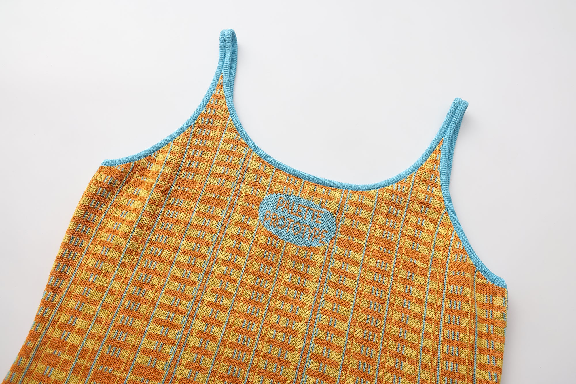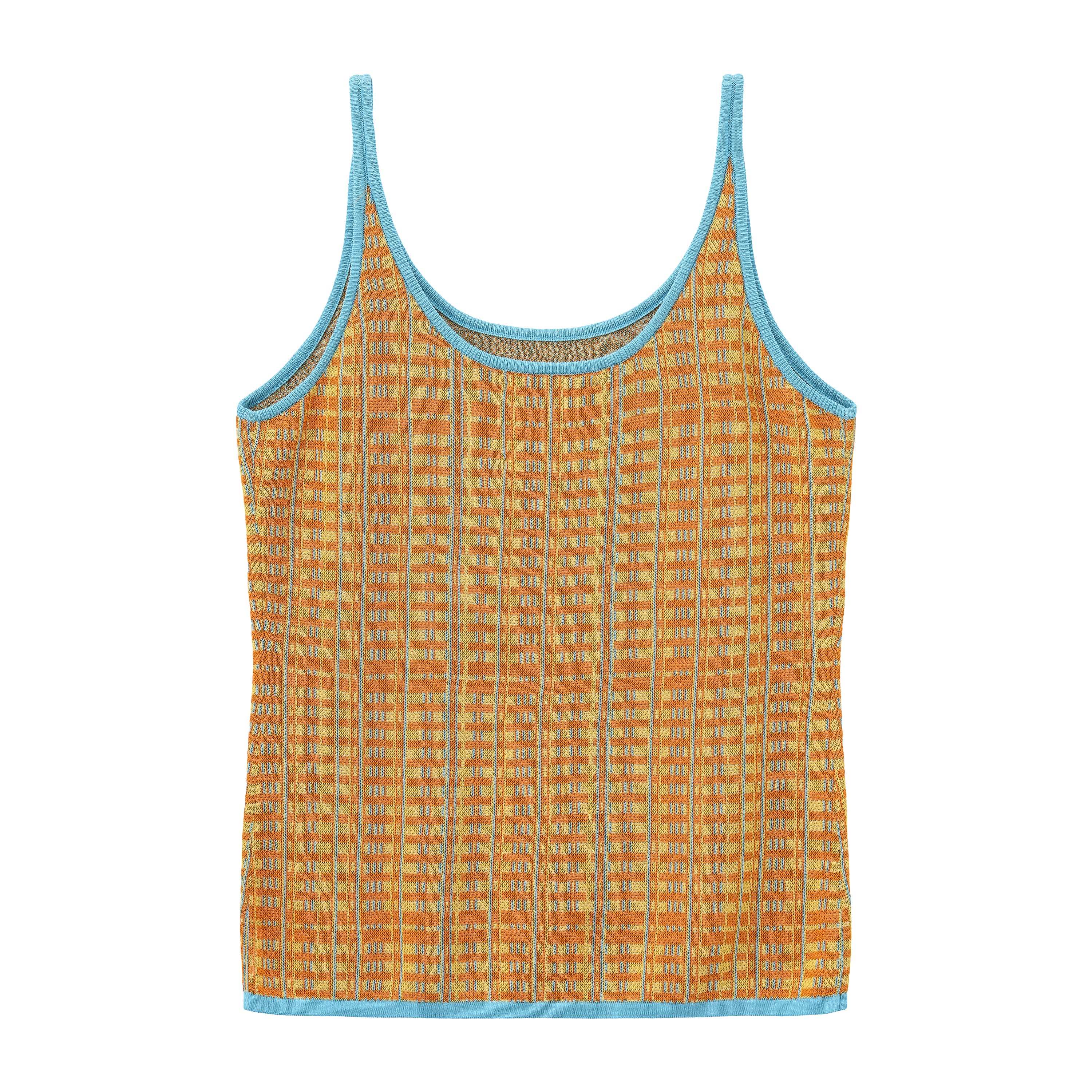 Fully fashioned knit tank in orange and yellow with an allover grid Jacquard and blue vertical accent lines running through the pattern. A small Jacquard logo sits at the chest in sky blue. Finished with contrast sky-blue rib-knit binding at the neckline, straps and hem.