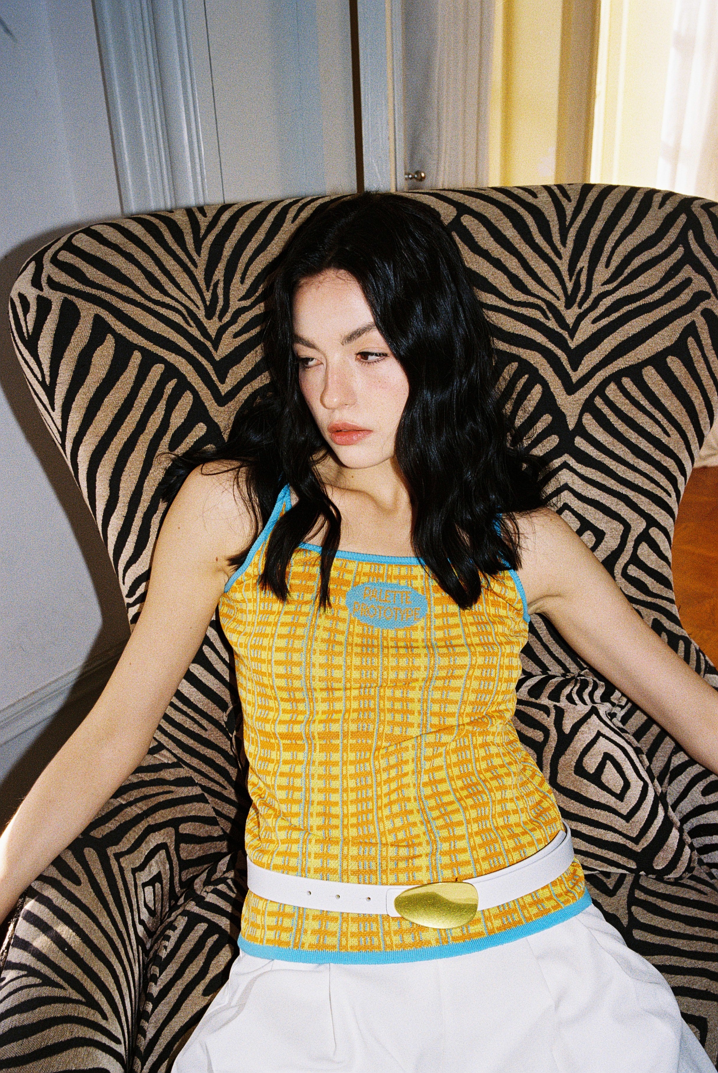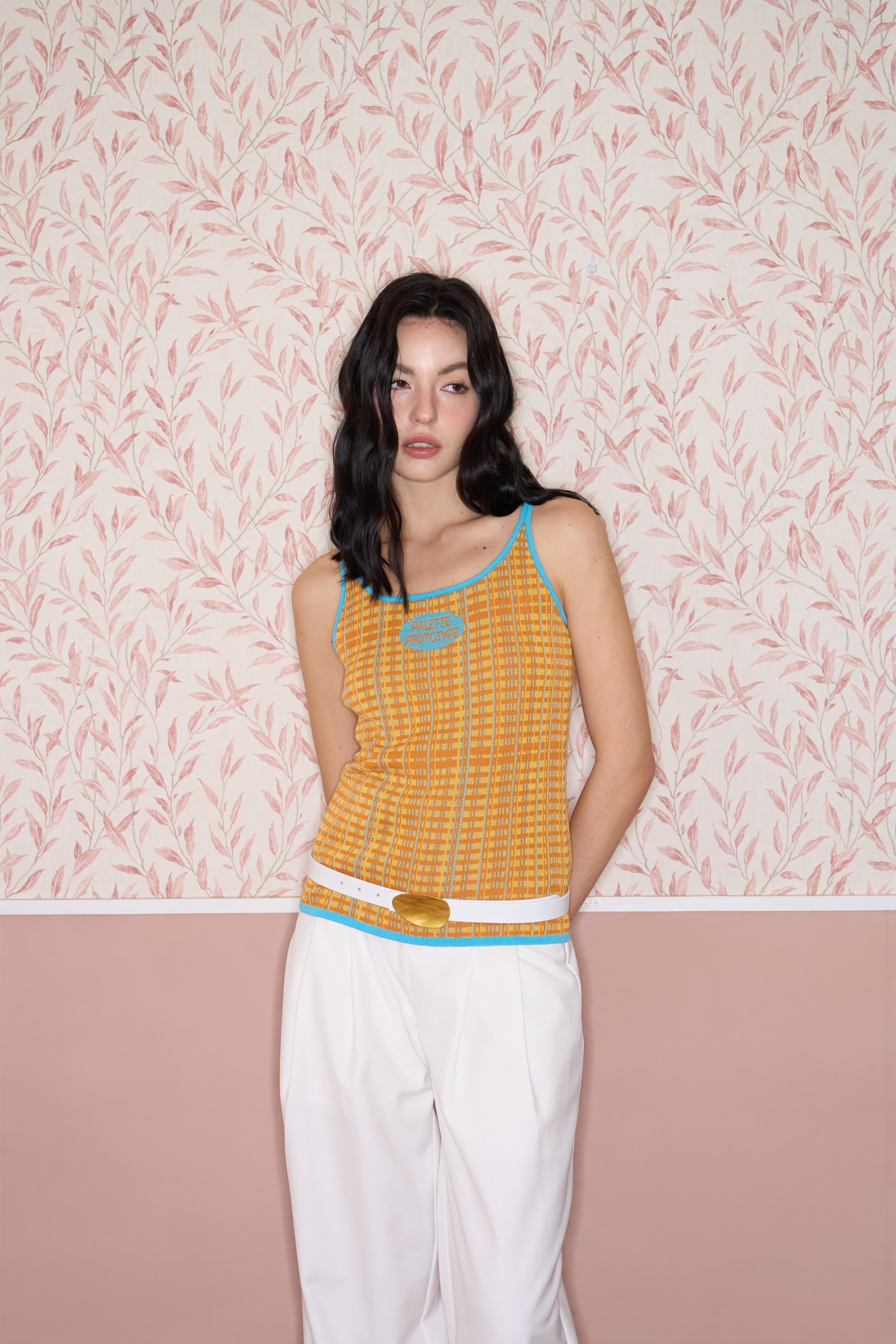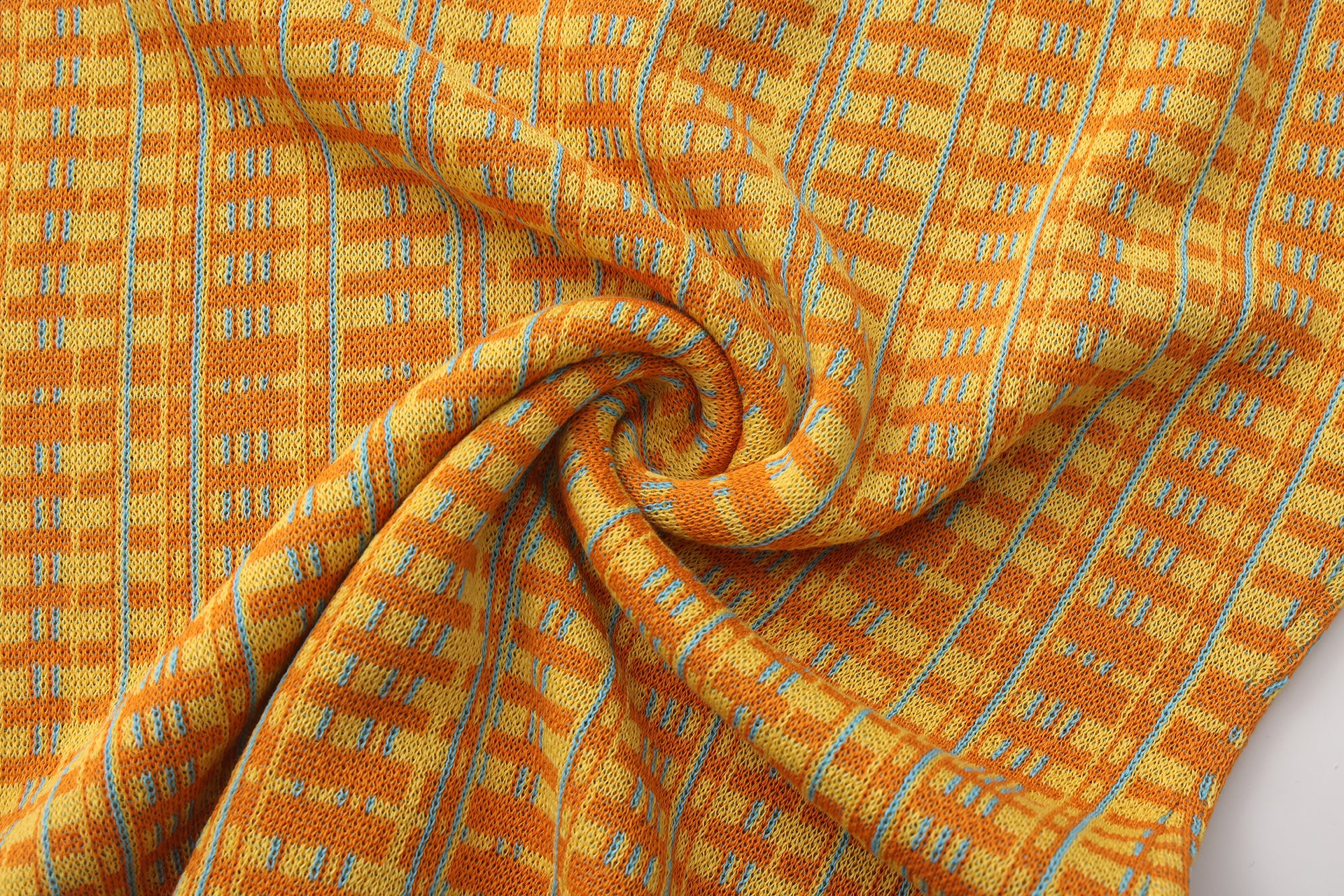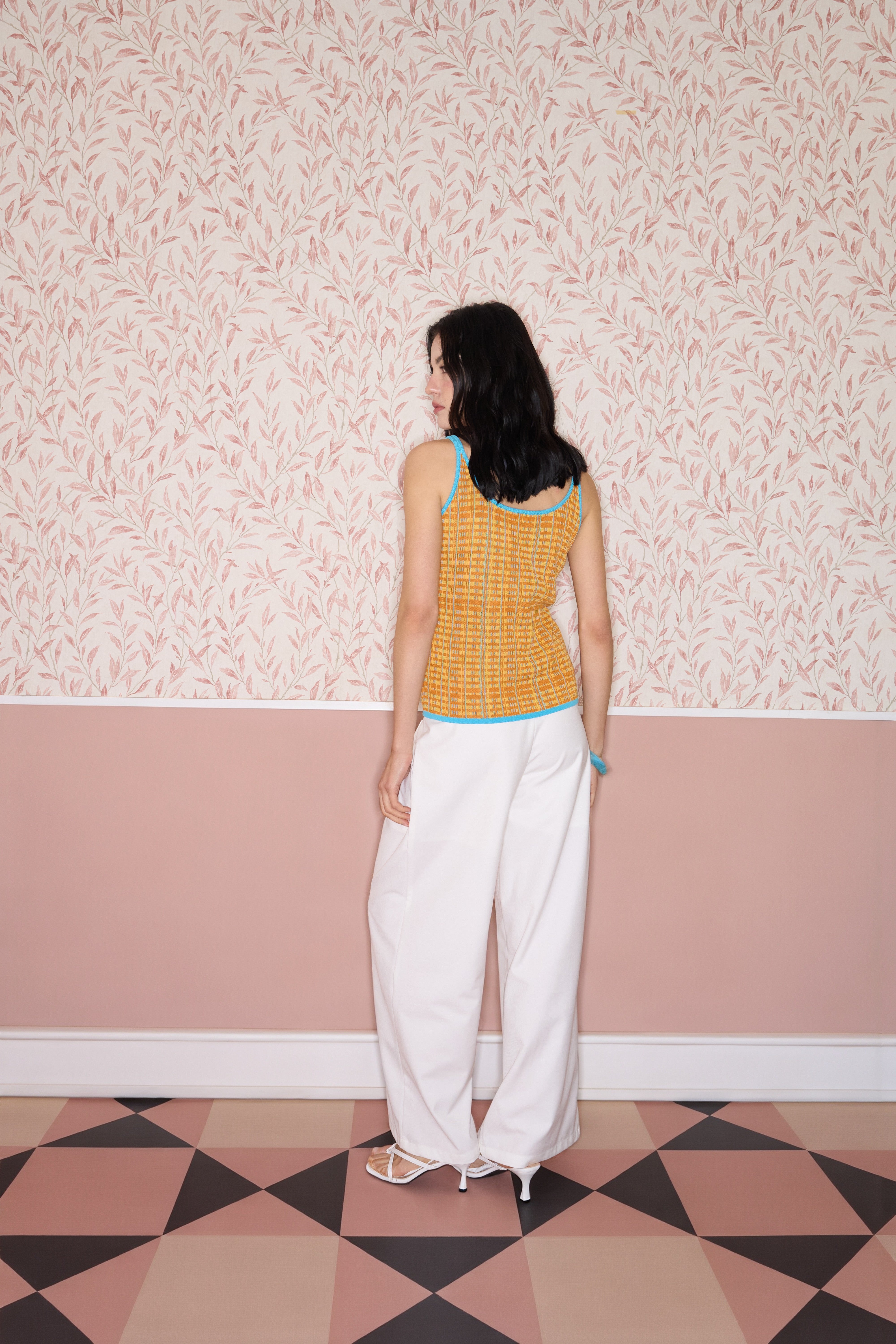 Fully fashioned knit tank in orange and yellow with an allover grid Jacquard and blue vertical accent lines running through the pattern. A small Jacquard logo sits at the chest in sky blue. Finished with contrast sky-blue rib-knit binding at the neckline, straps and hem.
