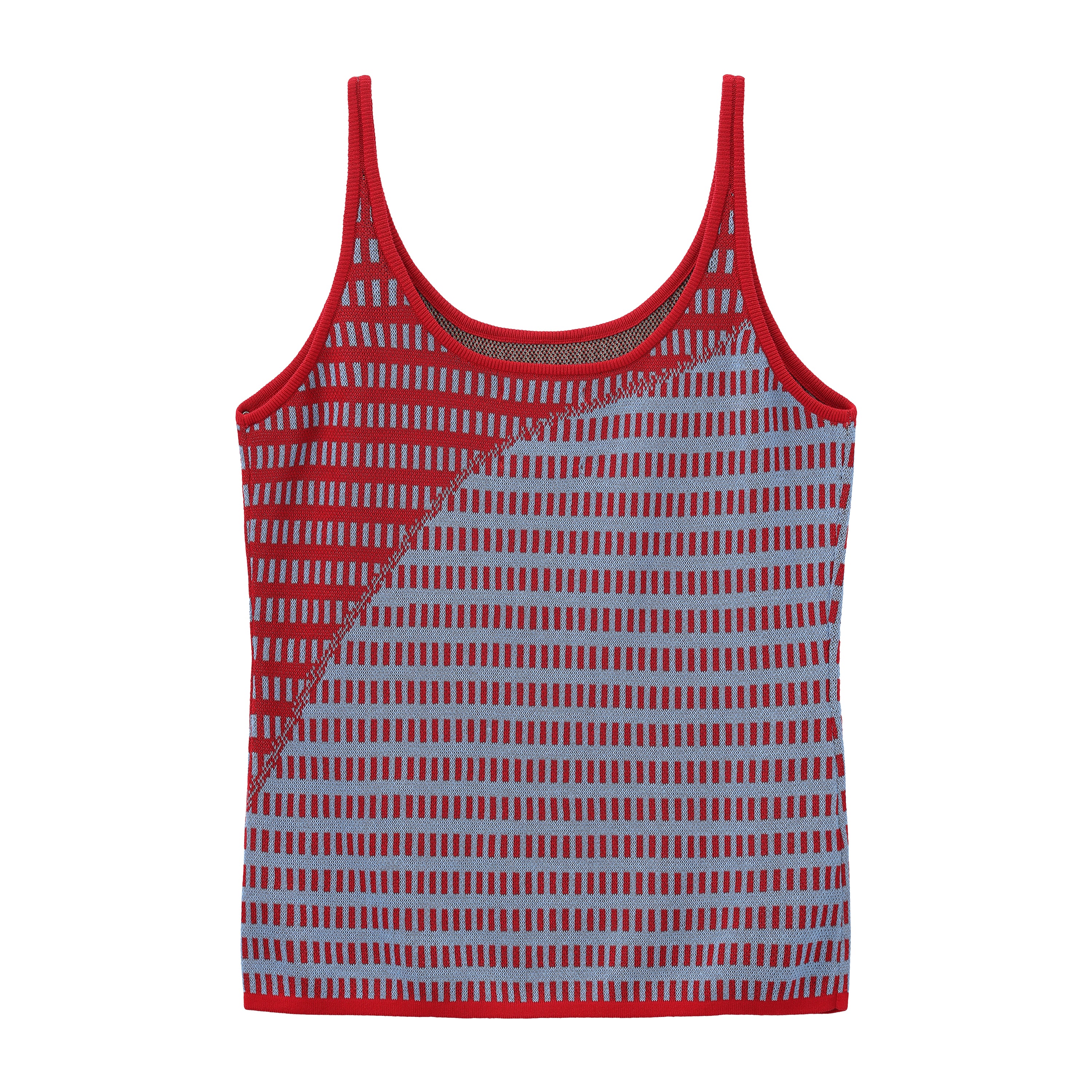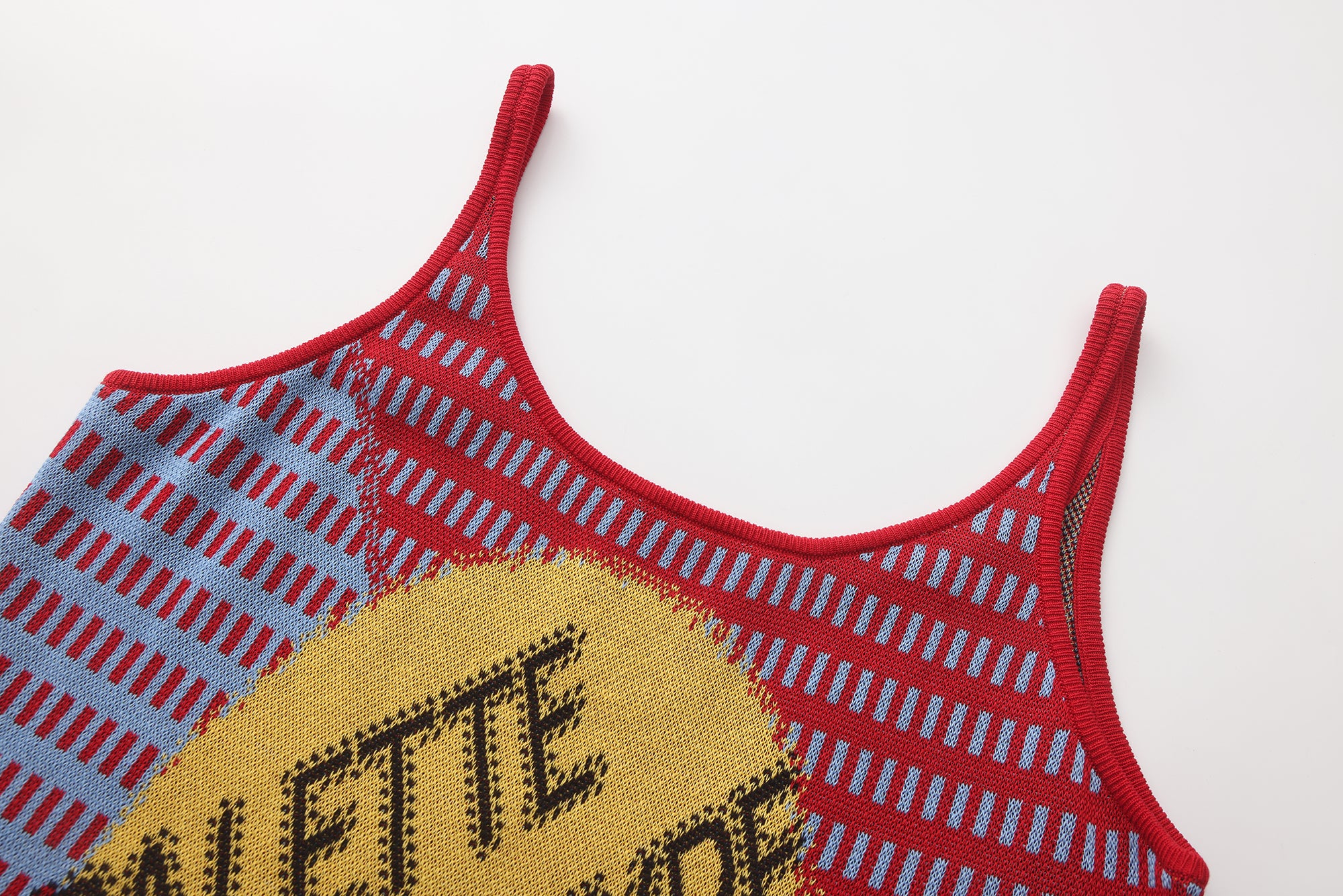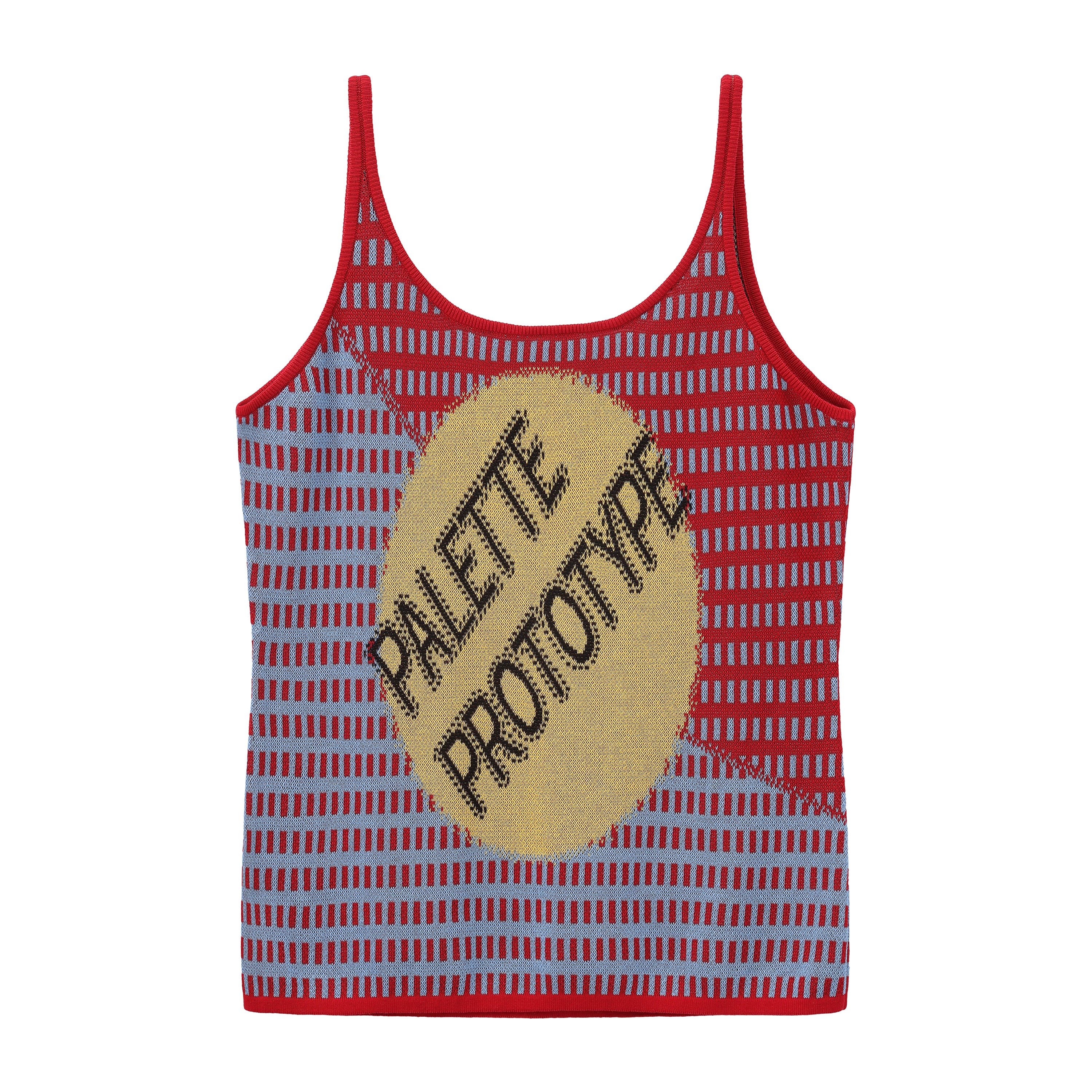 Fully fashioned knit tank in red and blue with an open dash-stripe construction and an oversized Jacquard logo motif in yellow. The semi-sheer body is lightweight and breathable, with a multi-colour yarn visible on the reverse. Finished with red rib-knit binding throughout.