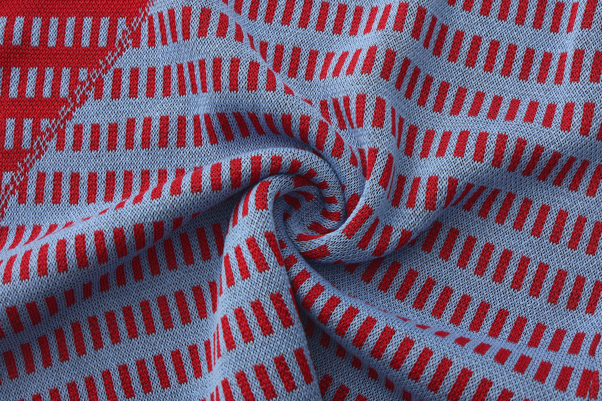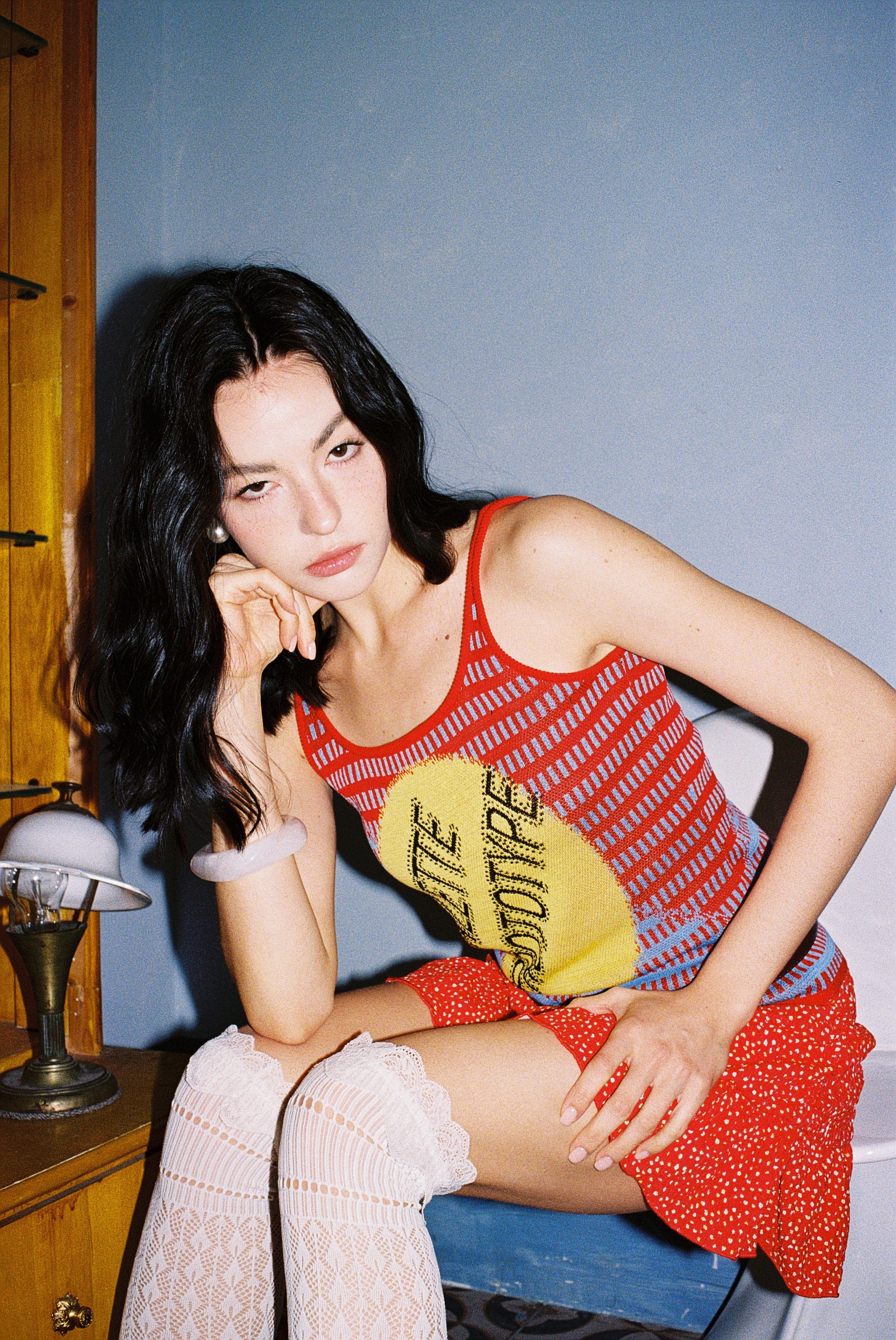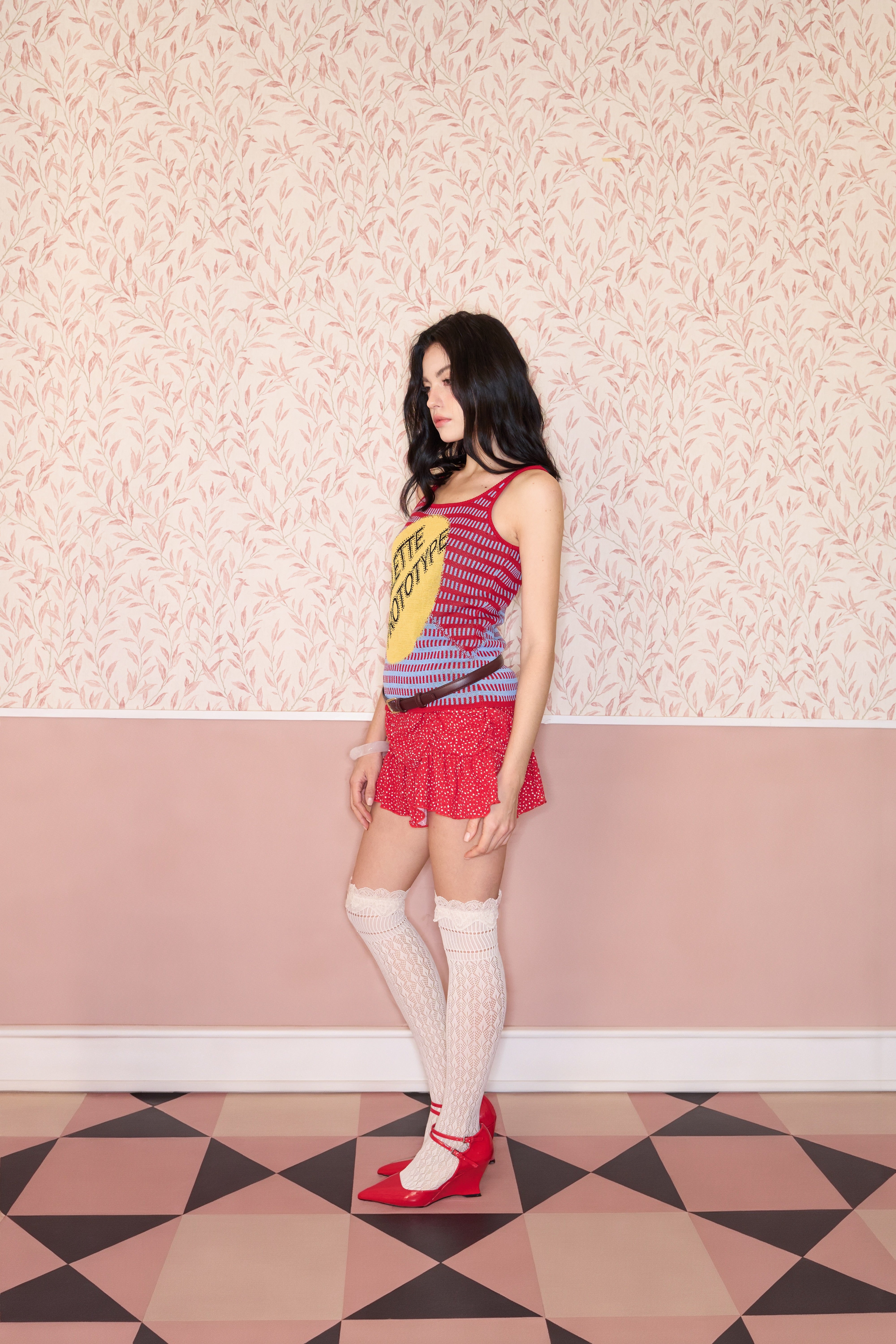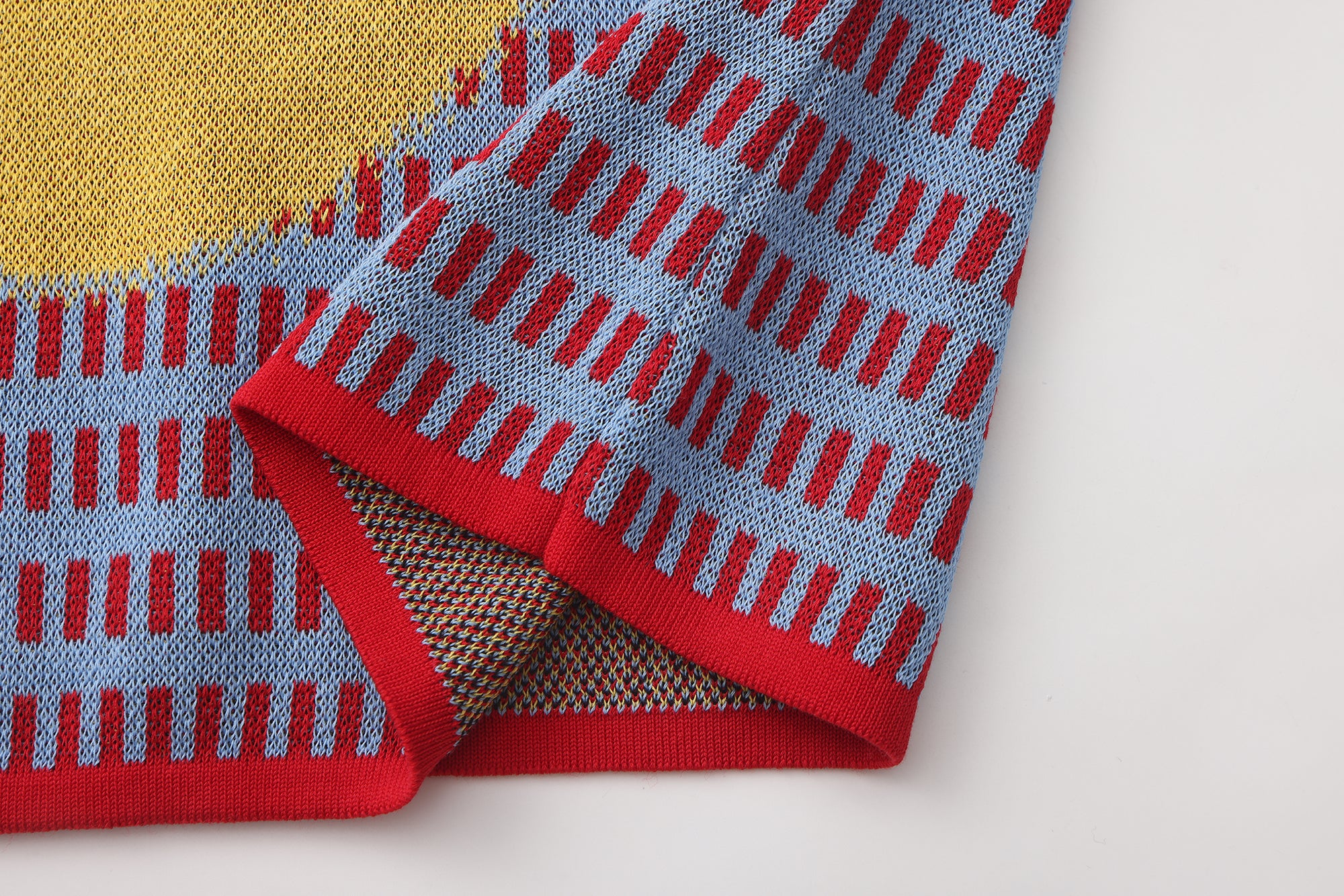 Fully fashioned knit tank in red and blue with an open dash-stripe construction and an oversized Jacquard logo motif in yellow. The semi-sheer body is lightweight and breathable, with a multi-colour yarn visible on the reverse. Finished with red rib-knit binding throughout.